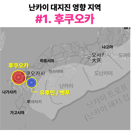 난카이 해역을 시작으로 지진이 연쇄적인 반응을 일으키면 사실 후쿠오카 오사카 도쿄 오카나와 삿포로 등 어디든 영향을 받지 않는 지역은 없겠지만, 한국 여행객들이 가장 많이 방문하는 일본 주요 도시 위주로 어떤 지역들이 더 영향을 받을지, 덜 영향을 받을지 알아볼게요.