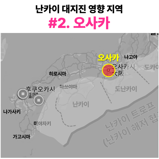 즉, 난카이 해역을 중심으로 일어나는 대지진에 오사카는 완벽하게 도난카이 해역 근처에 포함되기 때문에 대지진이 현실화 된다면 직접적인 피해을 받는 지역라는 것이죠.