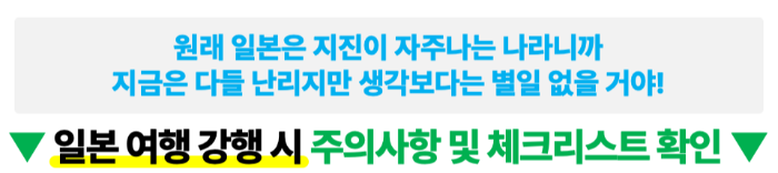 만일 일본 여행 취소를 하지 않고 강행할 경우지진 물품 준비와 함께 일본 여행 시 아셔야 할 긴급 상황에 대비한 주의사항과 체크리스트도 아래에서 같이 확인하고 가시면 좋을 것 같습니다.